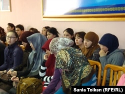 Девушки в платках сидят на встрече с представителями духовенства в Атырауском университете. 10 марта 2011 года.
