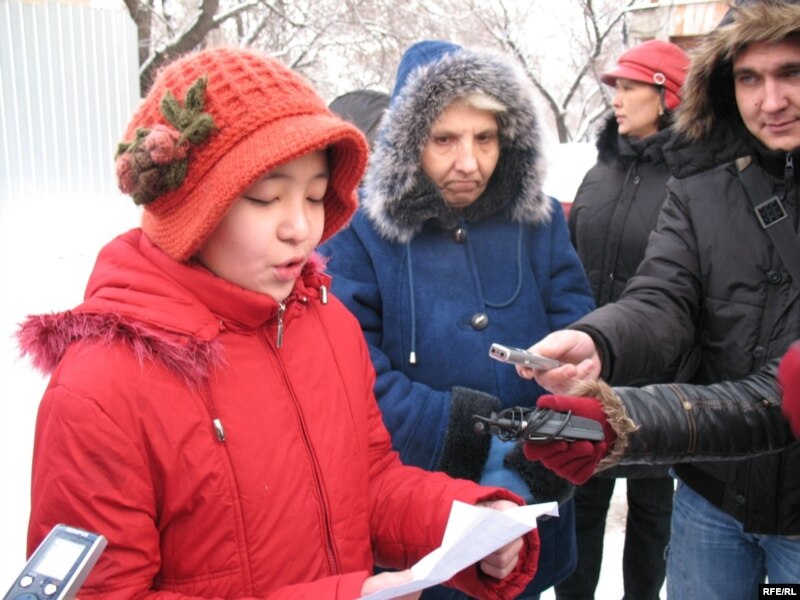 В это время вперед вышла маленькая девочка 11 лет, Аян Кольбай. Она – из семьи, выселяемой из общежития. Аян Кольбай тоже обратилась на имя акима Ахметжана Есимова. Маленькая девочка обратилась к акиму города Алматы с просьбой о подарке: