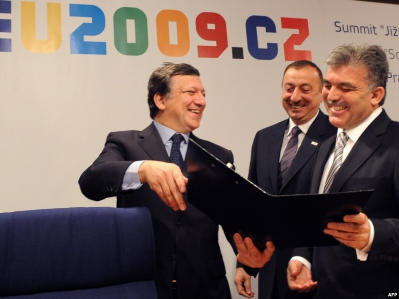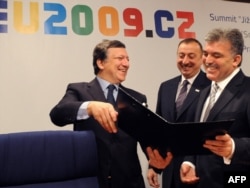 Глава Еврокомиссии Хосе Мануэль Баррозо показывает президентам Турции Абдулле Гулу (справа) и Азербайджана Ильхому Алиеву (в центре) подписанные на саммите в Праге документы. 8 мая 2009 года.