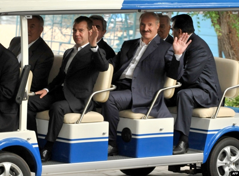 Президенты России Дмитрий Медведев и Беларуси Александр Лукашенко машут фоторепортерам во время неформального саммита ОДКБ в Кыргызстане. Чолпон-Ата, 31 июля 2009 года.