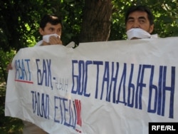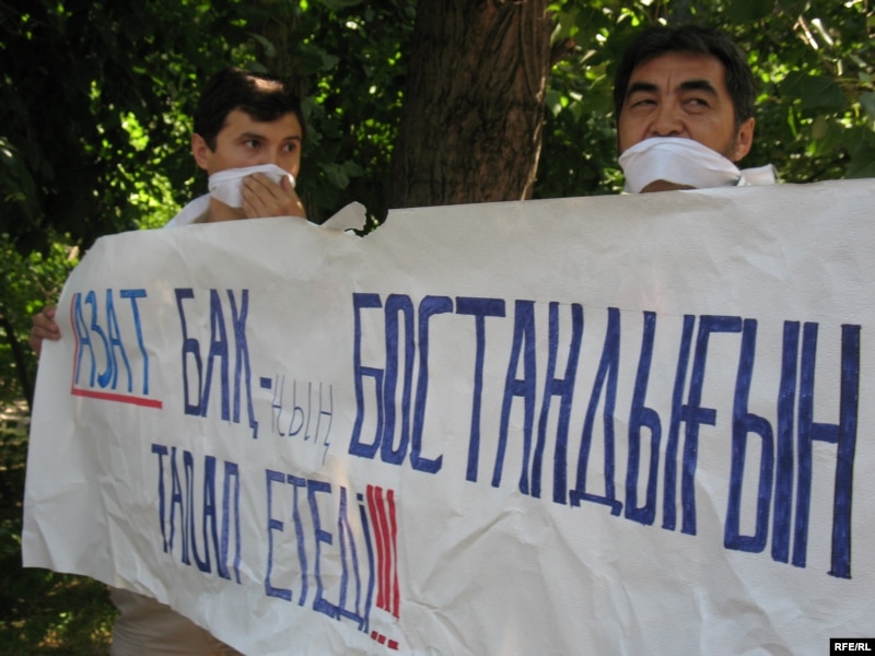 Участники акции протеста в защиту свободы слова держат в руках плакат с надписью "Партия "Азат" против давления на СМИ". Алматы, 24 июня 2009 года.