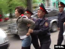 Полиция производит задержание журналиста оппозиционной газеты «Республика» Жанны Байтеловой во время акции протеста. Алматы, 1 мая 2010 года.