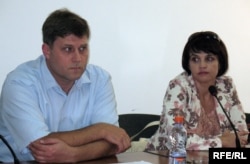 Адвокат Сергей Уткин и заместитель главного редактора газеты "Республика" Оксана Макушина на пресс-конференции. Алматы, 25 августа 2009 года.