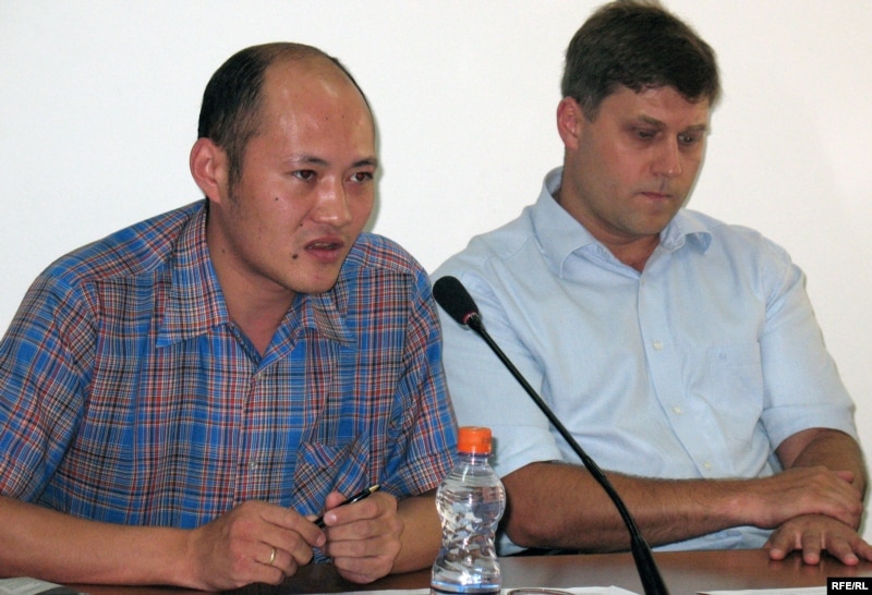 Редактор отдела газеты "Республика" Сергей Зелепухин и адвокат Сергей Уткин на пресс-конференции. Алматы, 25 августа 2009 года.