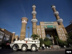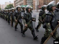 Китайские полицейские идут по улице после разгона небольшой акции протеста возле мечети. Урумчи, 10 июля 2009 года.