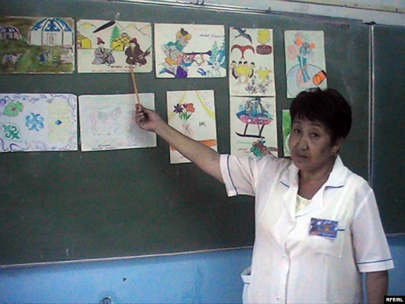 Преподаватель Зоя Ерманова показывает на детские рисунки Максата Айтбаева. Аул имени Нокина, 10 августа 2009 года.