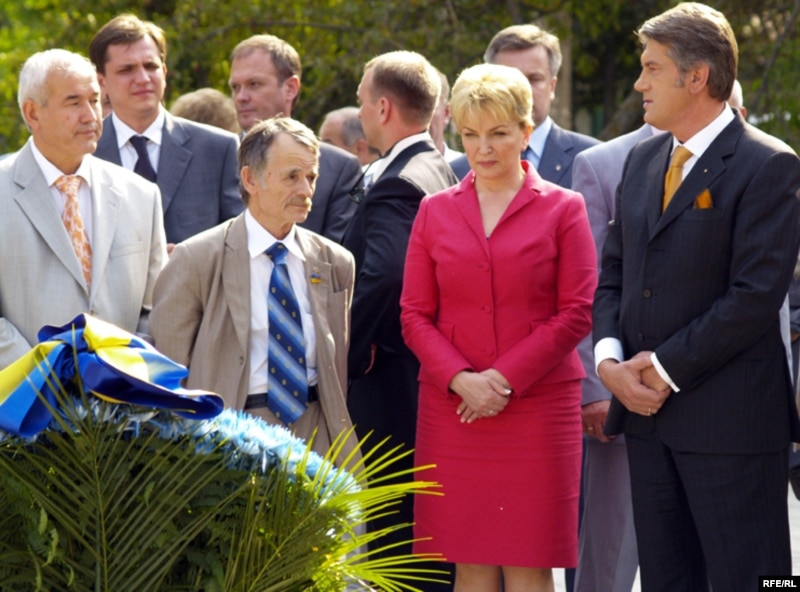 Президент Украины Виктор Ющенко (справа) и лидер крымских татар Мустафа Джемилев (второй слева) на церемонии возложения венков татарам, пострадавшим от изгнания. 9 июля 2009 года.