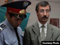 Рамазан Есергепов, осужденный на три года тюрьмы главный редактор независимой газеты «Алма-Ата Инфо», в момент доставки его в здание суда в день оглашения приговора. Тараз, 8 августа 2009 года.