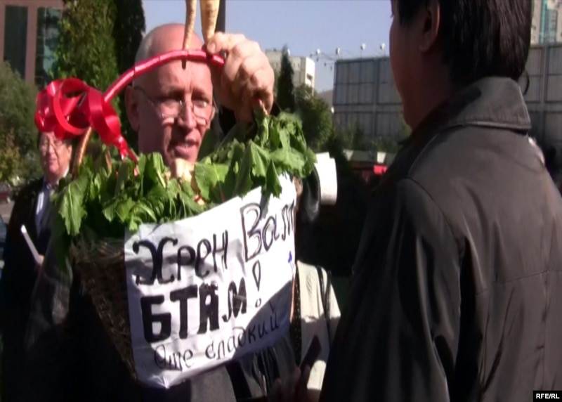 Владимир Козлов с корзиной хрена, на которой была надпись: «Хрен Вам БТАм».Алматы, 14 октября 2009 года.