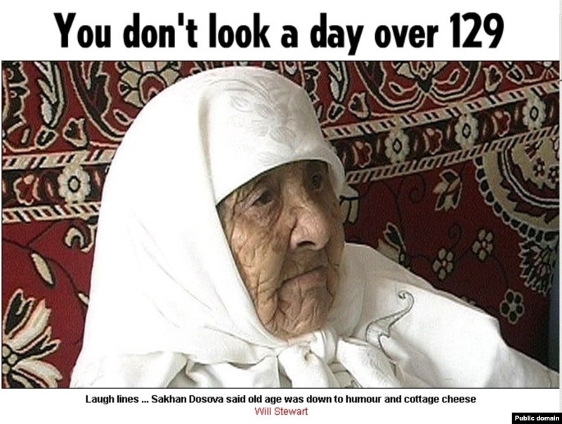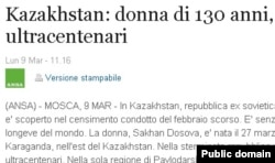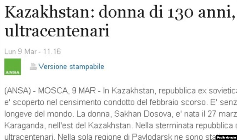 «В Казахстане, бывшей советской республике, живет 130-летняя женщина. Ее обнаружили во время переписи населения в конце февраля. Нет сомнений, что это одна из старейших женщин мира. Эта женщина, Сахан Досова, родилась 27 марта 1879 года и в настоящее время живет в Караганде». Эту информацию агентства ANSA в начале марта распространили многие итальянские масс-медиа.