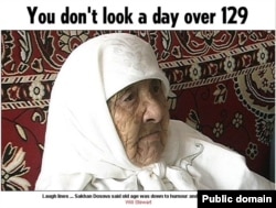 Но умиляет своеобразный юмор британской бульварной газеты the Sun, выразившийся в подзаголовке к фотографии Сахан Досовой. На русский язык эту надпись можно перевести как "Вы выглядите ни дня старше, чем на 129 лет".