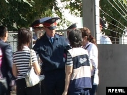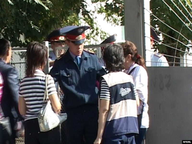 Полицейские у ворот наркологического диспансера запрещают людям входить во двор. Талдыкорган, 13 сентября 2009 года.