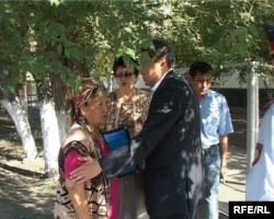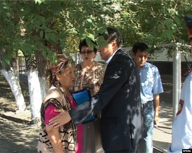 Чиновник успокаивает женщину, которая требует найти сына, проходившего лечение в наркодиспансере. Талдыкорган, 13 сентября 2009 года.