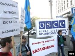 Представители казахской диаспоры в Польше пикетируют гостиницу, в которой проходит конференция ОБСЕ о правах человека. Варшава, 24 сентября 2007 года.