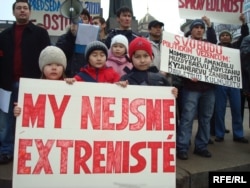 Дети казахских беженцев с плакатом на руках, где написано "Мы не экстремисты". Акция протеста казахских беженцев в Праге. 7 февраля 2009 года.