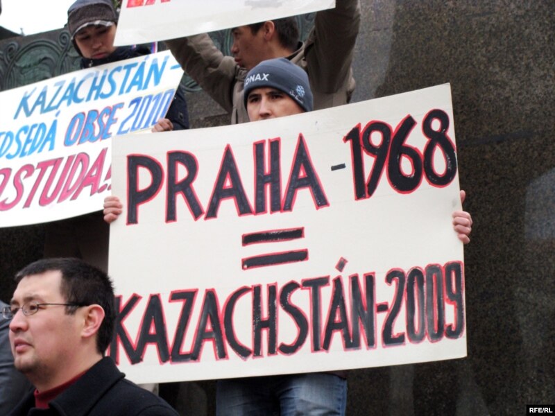 Казахские беженцы проводят пикет в Праге. На плакате написано "Прага-1968 = Казахстан-2009". Февраль 2009 года.