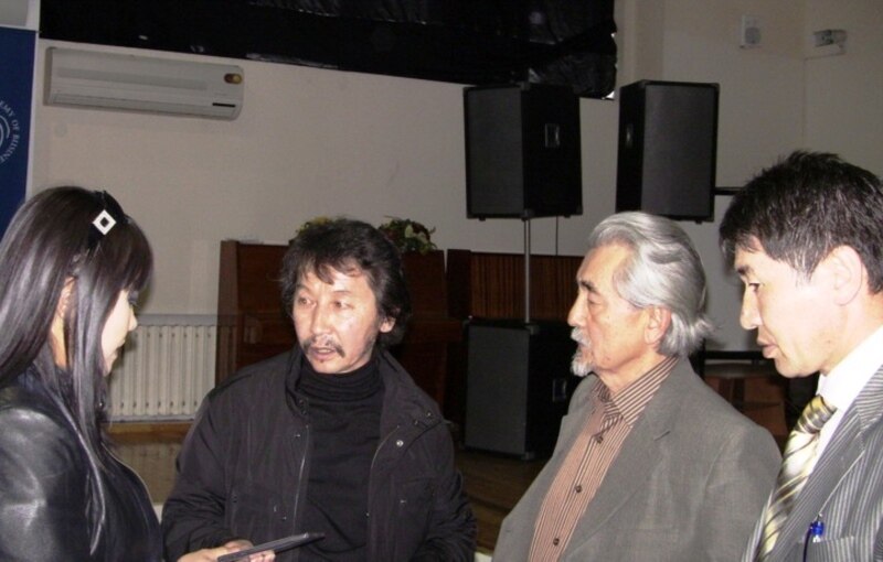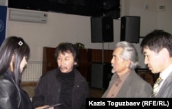 Режиссер фильма "Аллажар" Калдыбай Абенов (второй слева) и советник ректора Международной академии бизнеса Асылбека Кожахметова - Болат Дюйсембы (второй справа) после просмотра фильма "Аллажар". Алматы, 21 апреля 2011 года.