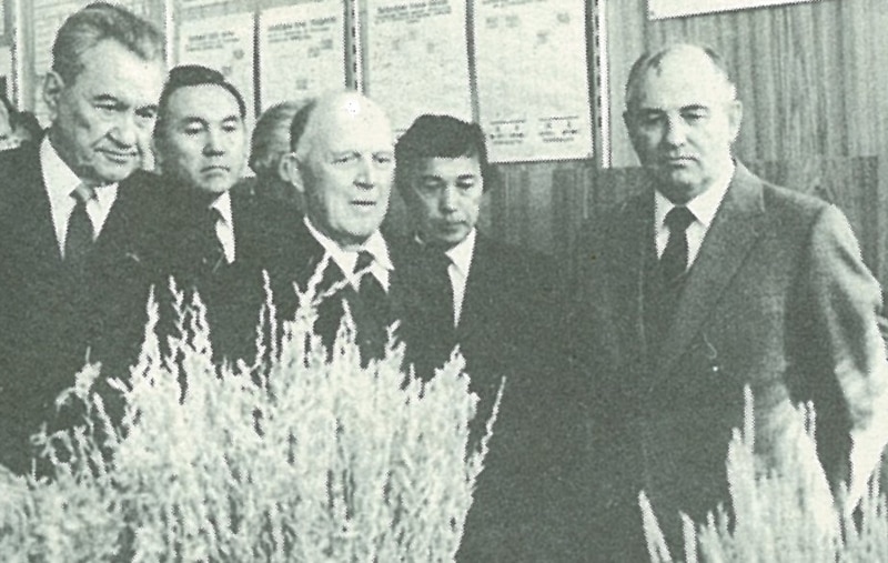 Первый секретарь ЦК Компартии Казахстана Динмухамед Кунаев, председатель Совета министров Казахской ССР Нурсултан Назарбаев (слева крайние), генеральный секретарь ЦК КПСС Михаил Горбачев (крайний справа). Целиноград, 1985 год.