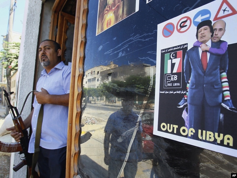 Справа - витрина с постером, на котором изображен Муаммар Каддафи и его сын Сейфа аль-Ислам. Внизу надпись – «Вон из Ливии». Триполи, 25 августа 2011 года.
