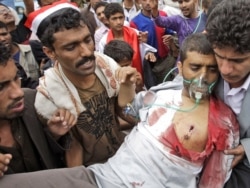 Йеменские демонстранты несут раненного в результате столкновения с силами безопасности. Сана, 1 июня 2011 года.