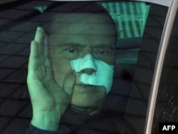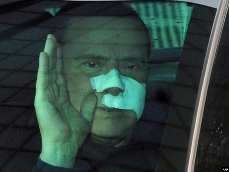 Премьер-министр Италии Сильвио Берлускони машет рукой журналистам в момент, когда покидает госпиталь, где ему была оказана медпомощь после физического нападения. Милан, 17 декабря 2009 года.