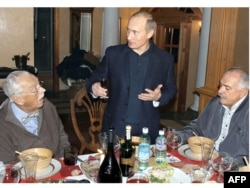 Владимир Путин в бытность президентом России поздравляет режиссера Никиту Михалкова (справа) с 60-летним юбилеем. Москва, 21 октября 2005 года.