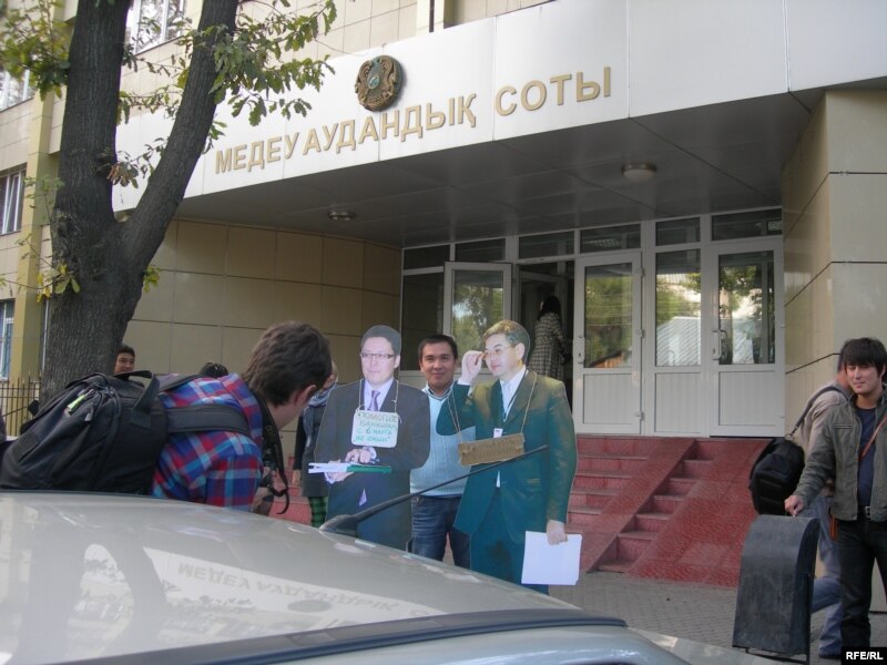 Журналисты газеты «Республика» проводят акцию протеста с картонными макетами руководителей БТА банка Анвара Сайденова и Армана Дунаева. Алматы, 8 сентября 2009 года.