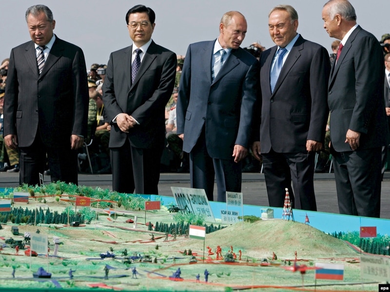 Слева направо: Курманбек Бакиев, Ху Цзиньтао, Владимир Путин, Нурсултан Назарбаев и Ислам Каримов на военных учениях в России. 17 августа 2007 года.