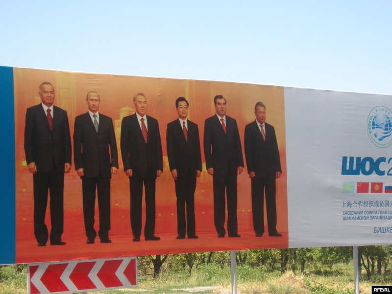 Билборд с изображением Ислама Каримова, Владимира Путина, Нурсултана Назарбаева, Ху Цзиньтао, Эмомали Рахмона и Курманбека Бакиева. Накануне саммита стран - участниц ШОС в Кыргызстане. 16 августа 2007 года.