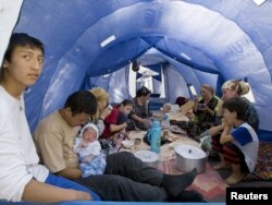 Беженцы-узбеки обедают в палатке в лагере беженцев. Поселок Карасу, недалеко от кыргызско-узбекской границы. 23 июня 2010 года.