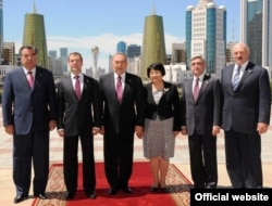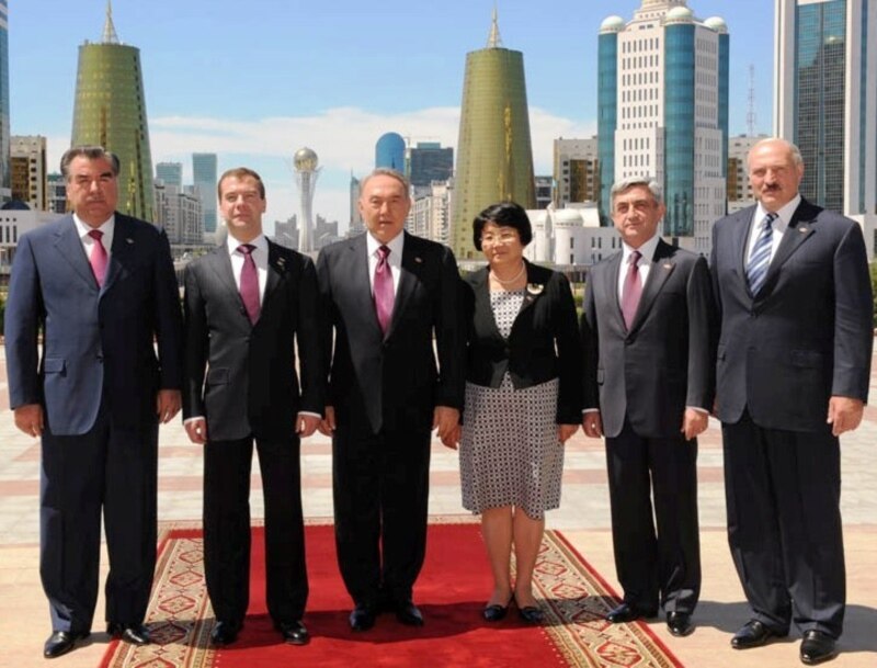 Слева направо: президенты Таджикистана Эмомали Рахмон, России - Дмитрий Медведев, Казахстана - Нурсултан Назарбаев, Кыргызстана - Роза Отунбаева, Армении - Серж Саркисян, Беларуси - Александр Лукашенко. Астана, 5 июля 2010 года. Фото с официального сайта президента Казахстана Нурсултана Назарбаева.