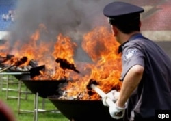 Китайские полицейские жгут около 400 килограммов наркотиков, конфискованных в ходе кампании по борьбе с наркоманией на юго-западной провинции Гуйчжоу. 26 июня 2004 года.