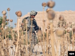 Американский солдат патрулирует на маковом поле в селе Бала Балук, провинция Фарах, Афганистан. 28 мая 2010 года.