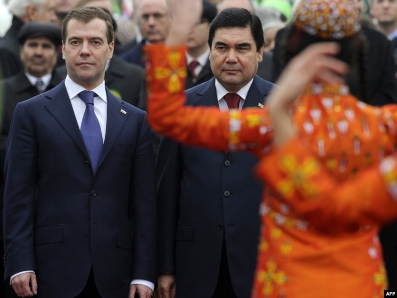 Президент Гурбангулы Бердымухамедов и президент России Дмитрий Медведев на открытии новой русской школы. Ашгабад, 22 декабря 2009 года.