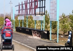 Женщина с детской коляской гуляет по Аллее Жертвам Репрессий 30-50-х годов. Поселок Акмол, 14 апреля 2011 года.