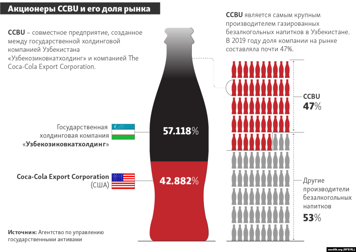 В 2019 году Мирзиёев подписал указ о продаже с аукциона акций десятка государственных предприятий и объектов недвижимости. В июне прошлого года стало известно о продаже 57,1-процента доли Узбекистана в совместном предприятии CCBU.