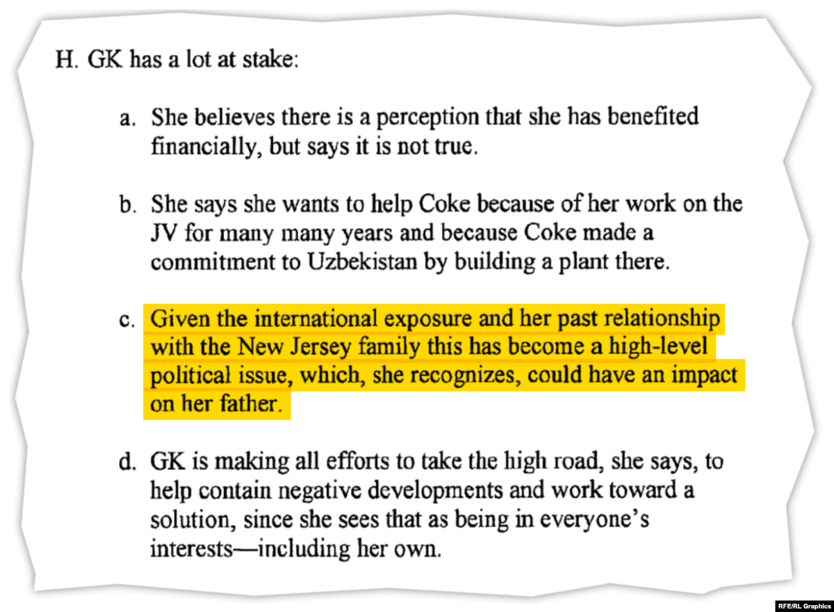 «Учитывая международное внимание и ее прошлые отношения с семьей в Нью-Джерси, это превратилось в политический вопрос высокого уровня, который, как она [Каримова] признает, может сказаться на ее отце», – говорится в записке.