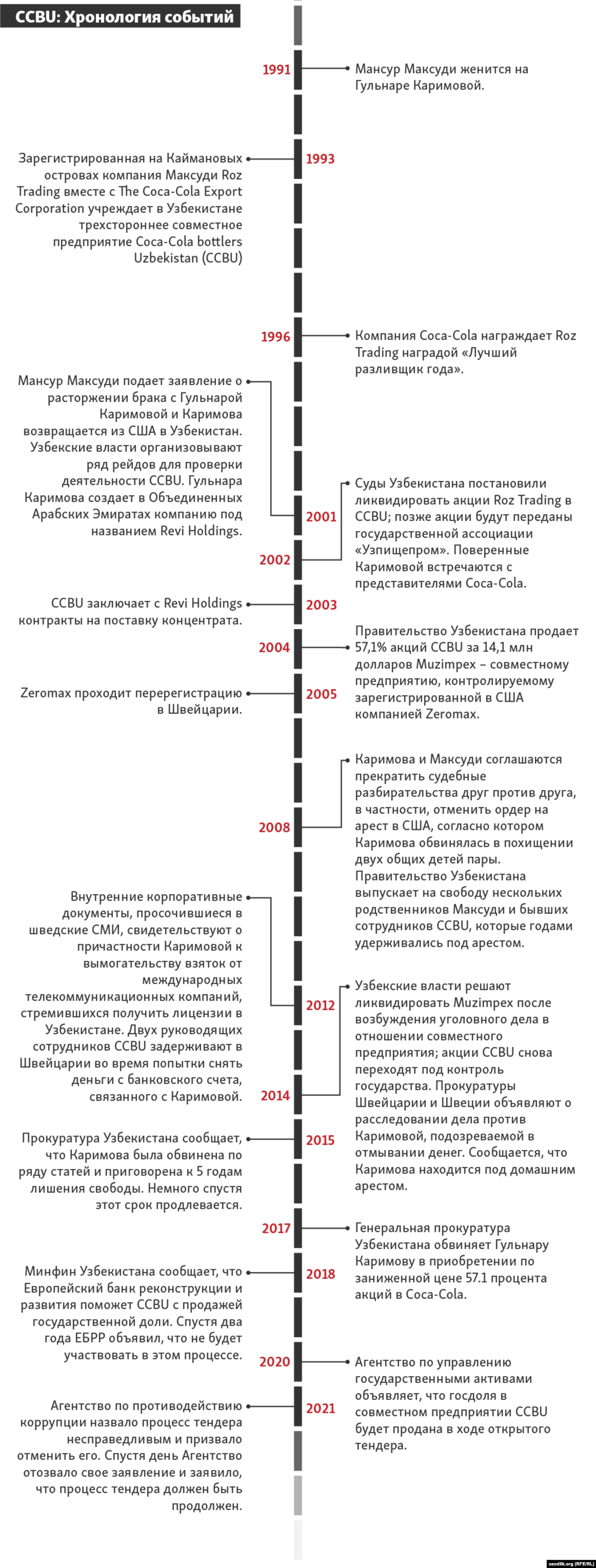 «Сколько раз правительство Узбекистана будет пытаться «приватизировать» акции Coca Cola Bottlers Uzbekistan Ltd.?, – говорится в заявлении семьи Максуди, направленном в редакцию «Озодлика». – Это коррупционный процесс длительностью почти 20 лет, который начался с незаконной конфискации 55 процентов наших акций в CCBU, а затем продолжился неоднократной «приватизацией» акций CCBU правительством Узбекистана».