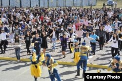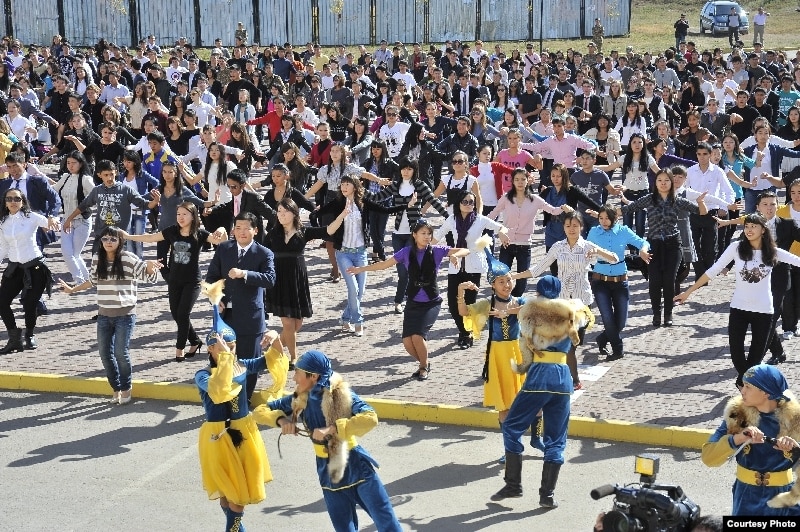 Ректор Казахского гуманитарно-юридического университета Максут Нарикбаев говорит, что цель этого мероприятия – через танец помочь развитию казахского языка и национального духа казахов. Максут Нарикбаев – один из бывших высших чиновников и политиков Казахстана, причем его карьера состоялась в ту пору, когда Нурсултан Назарбаев, его однокурсник по техническому училищу, стал президентом Казахстана.