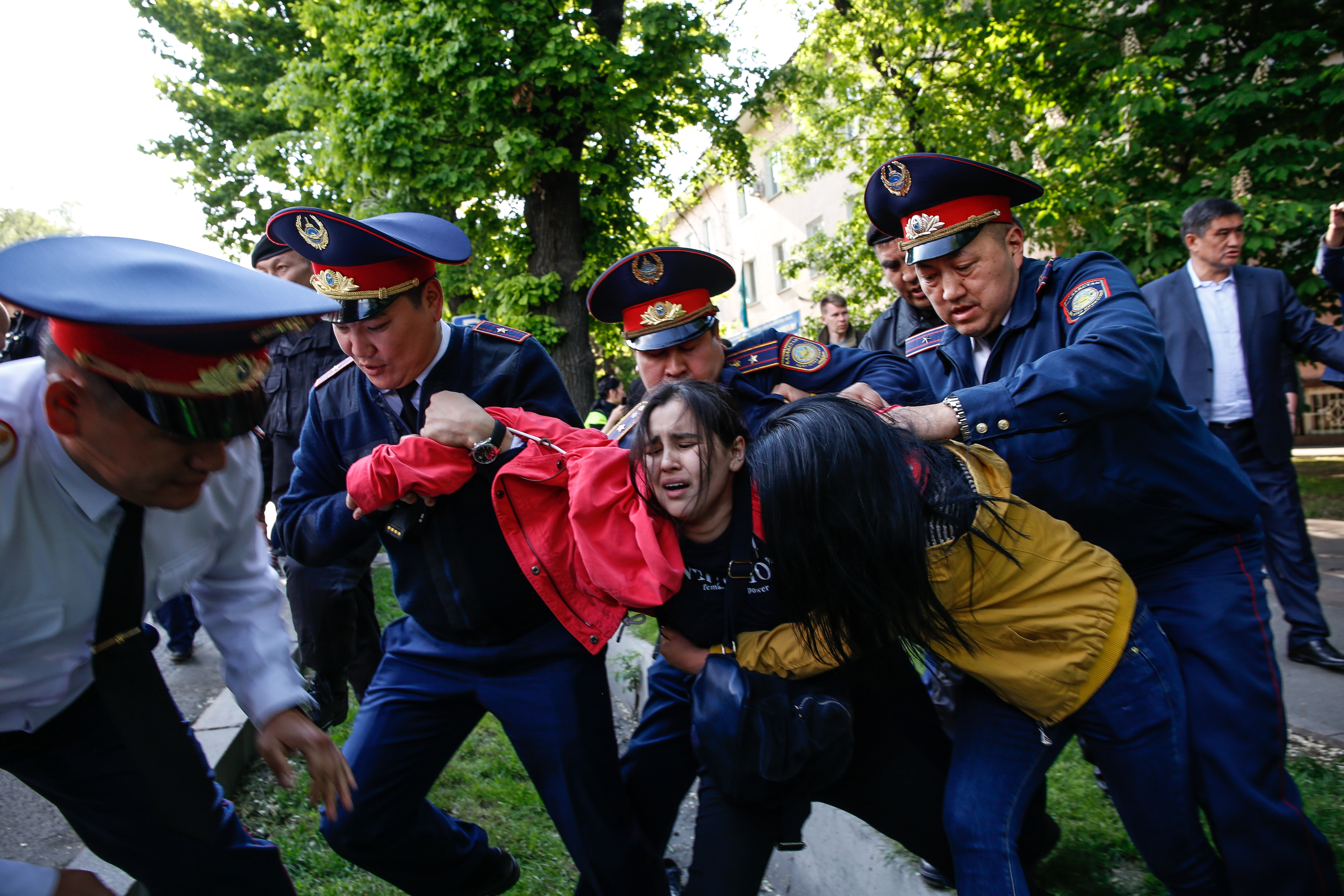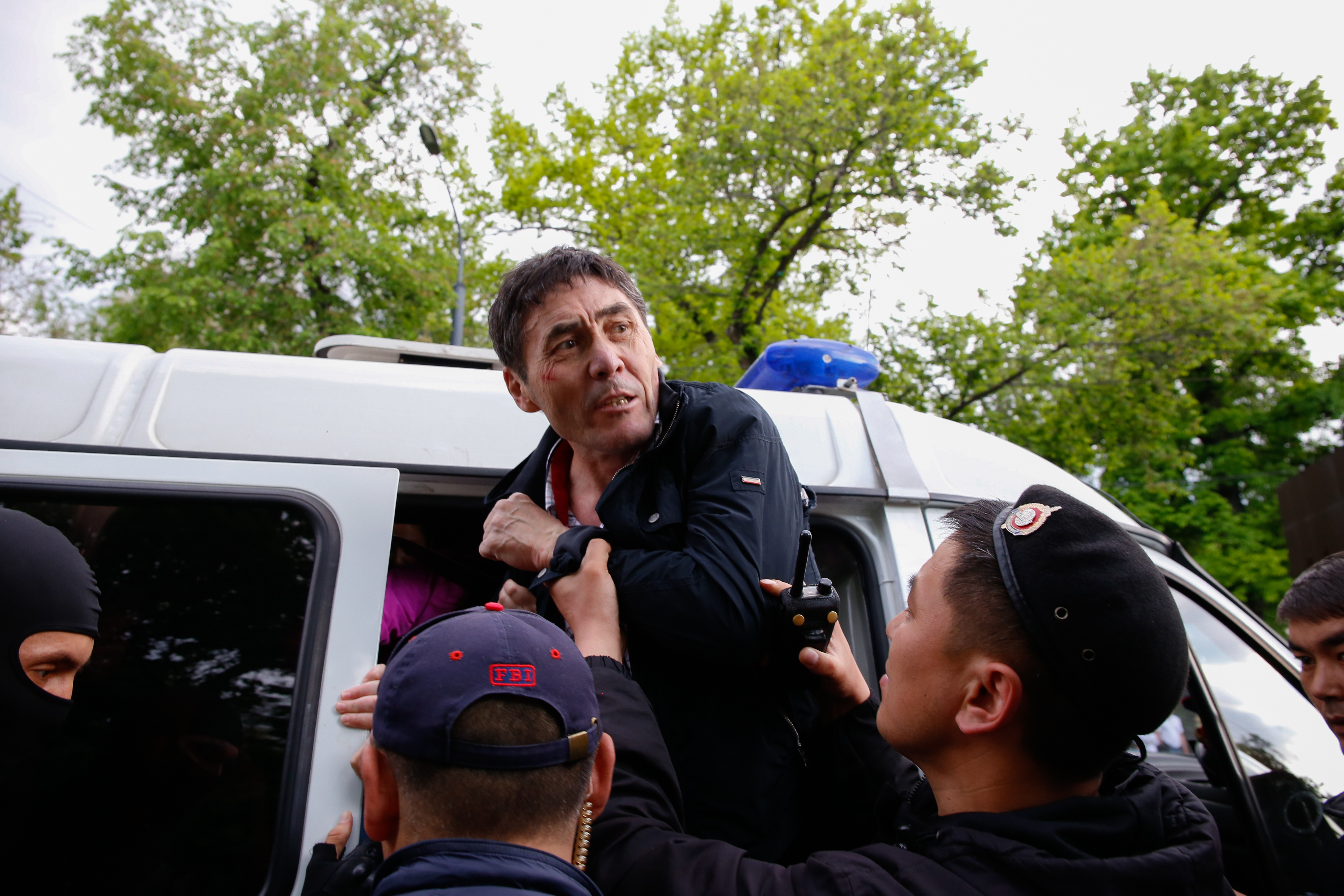 Шествие продлилось около 15 минут: напротив Парка 28 гвардейцев-панфиловцев к обочине, где остановились митингующие, подъехали автозаки. Началась суматоха: крепкие ребята в форме умело выхватывали людей из толпы и тащили к автобусам. Те сопротивлялись, кому-то удавалось отбиться, их оставляли в покое и принимались за других.