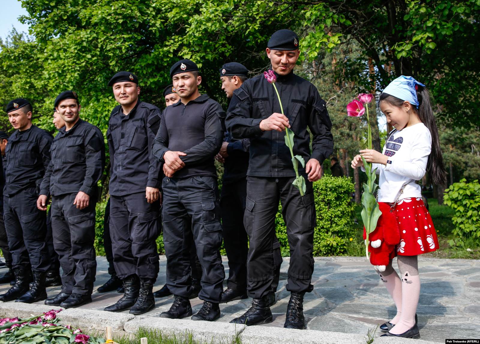 Одна из женщин протянула своей дочке охапку тюльпанов со словами: «Подари дядям». Та побежала раздавать цветы.