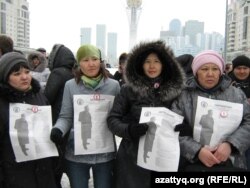 Участники акции прикрепили к груди обращение с требованием к Нурсултану Назарбаеву отказаться от проведения внеочередных выборов президента. Астана, 28 марта 2011 года.