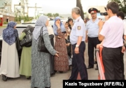 Полицейские не допускают к зданию прокуратуры жен узбекских беженцев-мусульман. Алматы, 9 июня 2011 года.