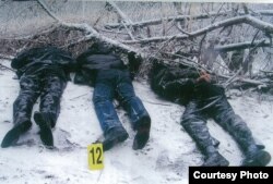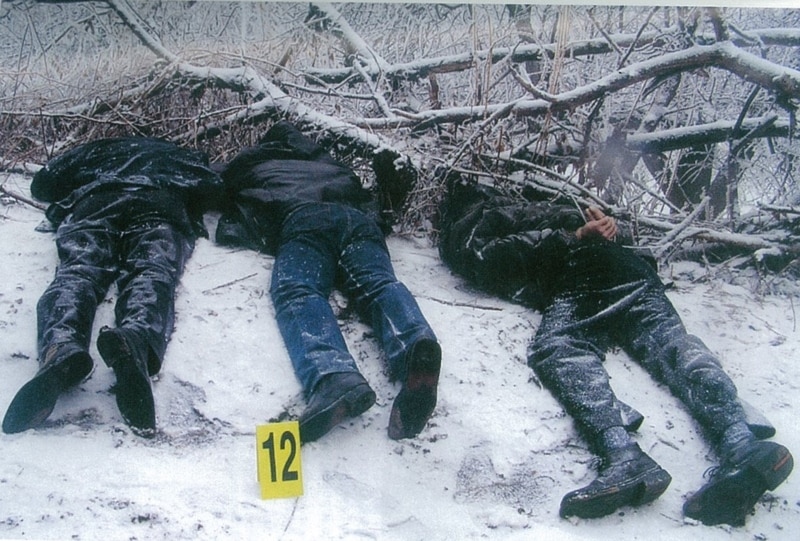 Тела убитого оппозиционного политика Алтынбека Сарсенбаева, его помощников Василия Журавлева и Бауыржана Байбосына, найденные возле поселка Коктобе близ Алматы 13 февраля 2006 года. Фото из книги Рахата Алиева «Крестный тесть».