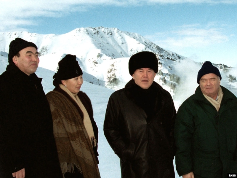 Аскар Акаев с супругой Майрам, Нурсултан Назарбаев и Ислам Каримов осматривают панораму горнолыжной базы Чимбулак в Казахстане.