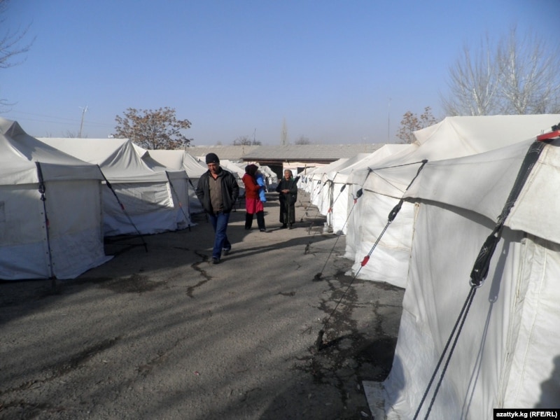 Палаточный городок беженцев, которые там и встретили зимние холода. Село Шарк Ошской области, 6 декабря 2010 года.