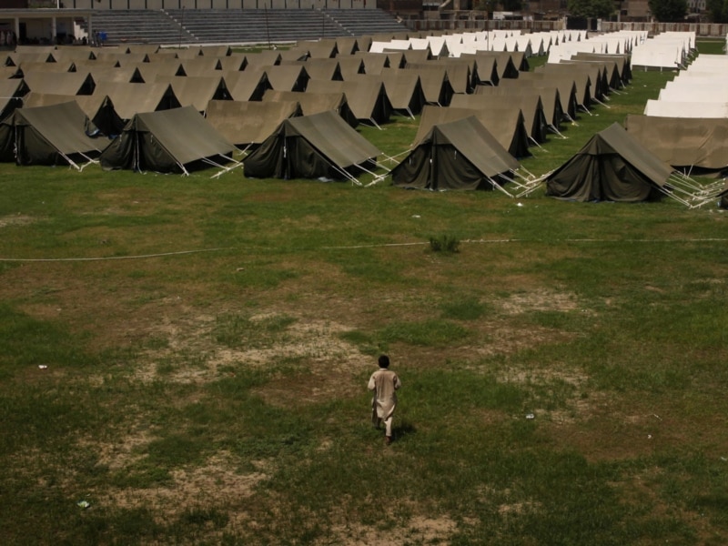 Мальчик бежит на спортивную площадку колледжа, на территории которой разместили временное жилье для жертв наводнения в пакистанской провинции Хайбер-Пахтунхва в 2010 году.