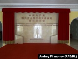 Экспозиция начинается на первом этаже с большой красивой надписи золотыми иероглифами и русским переводом "Постоянно действующая выставка, посвященная Шестому съезду коммунистической партии Китая". Надпись обрамлена красными портьерами. Широкая мраморная лестница ведет на второй этаж, где воссоздан интерьер зала заседаний съезда.