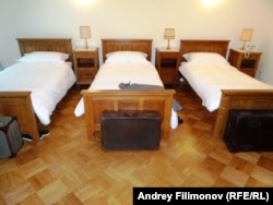 Зато обстановка комнаты, в которой жили депутаты съезда, воспроизведена с большой любовью. Блестящий паркетный пол, три кровати, застеленные чистым бельем, три кожаных чемодана в ногах кроватей, лампы прикроватные, тоже три штуки. В углу круглый столик с пепельницей и какими-то заметками от руки.