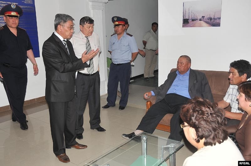 Заместитель прокурора Атырауской области Хабиболла Касымов и первый заместитель начальника ДВД Жанболат Ульжабаев общаются с родственниками Кабидоллы Шолакова в областной прокуратуре. Атырау, 26 мая 2009 года.